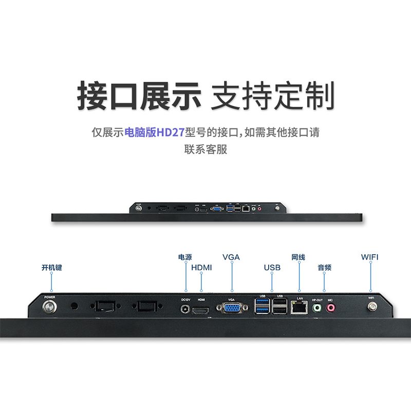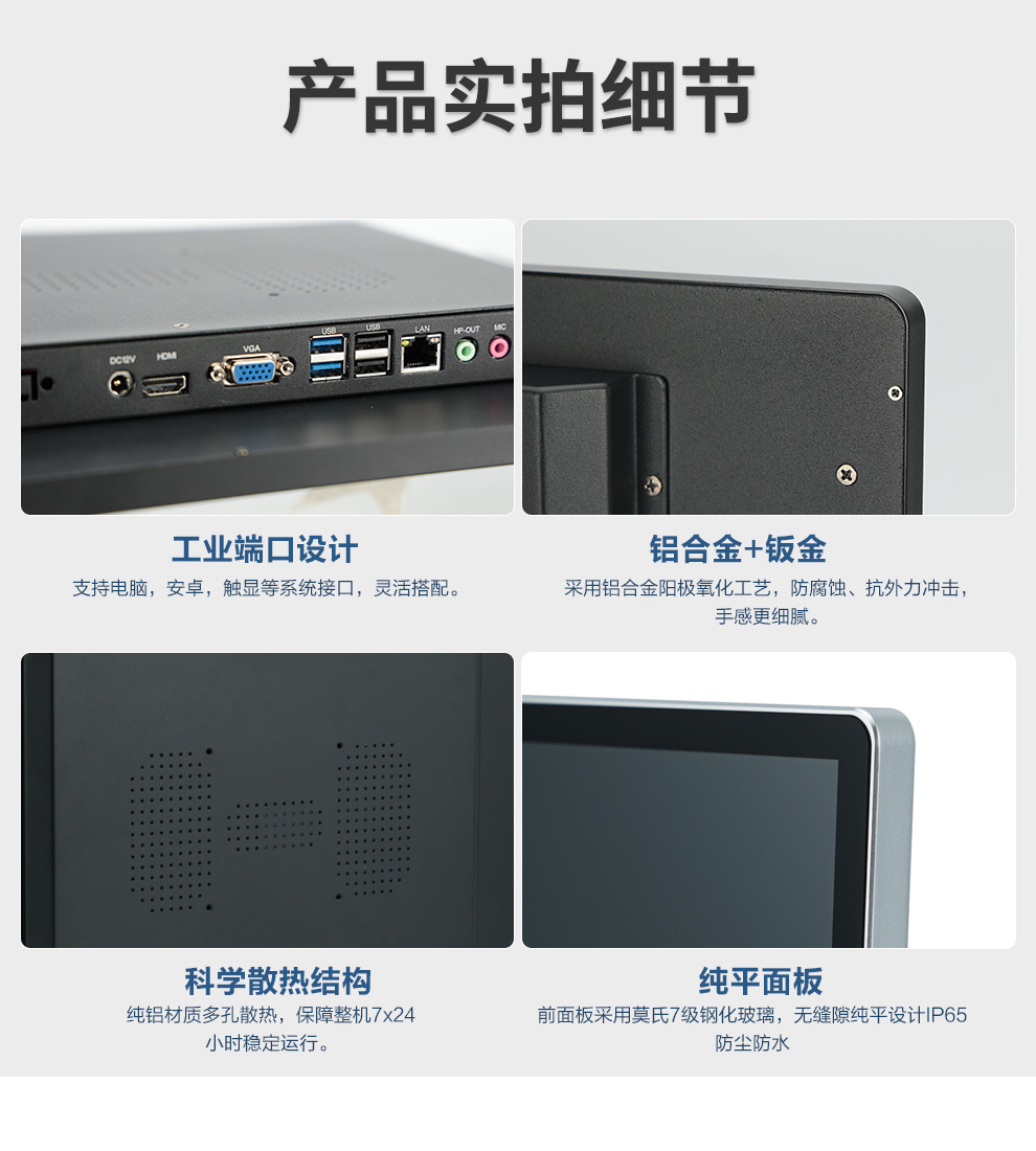 • 产品介绍: 1.结构工艺:整机采用全新背光一体结构设计,铝合金的边框+钣金后壳,坚实耐用,耐蚀抗氧化 2.电容触控:采用防爆钢化玻璃面板,触摸精准、响应快、触摸寿命长,感应精度高,响应速度快,支持更加精细化的操作,表面可进行光面或雾面处理,可支持颜色、丝印LOGO、文字等个性定制 3.高清显示:采用LED背光源液晶屏,低功耗,色彩艳丽、自然、通透,支持多屏幕同显/异显,轻松扩展多屏同步/异步显示 4.兼容系统:可提供单触摸显示器,安卓触控一体机,电脑触控一体机 5.性能稳定:每台机器经整机老化、温湿度测试、静电检测、震动、高压、触控点击、显示等多道检验,确保品质稳定 6.支持定制:提供多种定制化服务,灵活增加多个串口、U口;(如:外观颜色、logo、4G模块等) 7.品质严控、严格检测:整机经过48小时老化,静电检测、震动、高压、触控点击、显示等多道检验。稳压/电子负载测试、耐压测试、触摸/校准检测、可控高温测试、恒温恒湿测试、可控式跌落测试。 8.安装简便:支持壁挂/桌面/嵌入等多种安装方式,通电即插即用,无需调试。